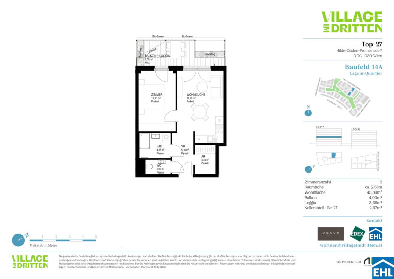 Im dritten Wiener Gemeindebezirk entsteht mit dem VILLAGE IM DRITTEN ein neues Stück Stadt – eines der größten Stadtentwicklungsgebiete Wiens. Auf über elf Hektar entwickelt die ARE Austrian Real Estate gemeinsam mit der Stadt Wien und dem wohnfonds_wien ein lebendiges, nahezu autofreies Quartier mit rund 2.000 Wohnungen, Büro- und Gewerbeflächen, Kinderbetreuung, Bildungseinrichtungen und Nahversorgung. Das grüne Herz bildet der über 2 Hektar große Bert-Brecht-Park –eine Oase für Erholung, Begegnung und Spiel. Alle Dächer, die nicht begehbar sind, werden begrünt. Sharing-Angebote, Einkaufsmöglichkeiten und Gastronomie liegen direkt vor der Haustüre. Nachhaltigkeit, kurze Wege und hohe Lebensqualität sind die Leitlinien dieses neuen Stadtviertels.