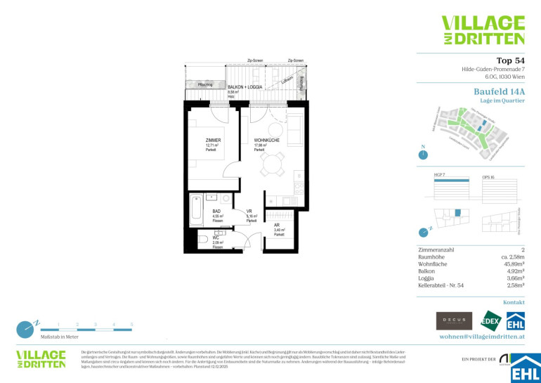 Im dritten Wiener Gemeindebezirk entsteht mit dem VILLAGE IM DRITTEN ein neues Stück Stadt – eines der größten Stadtentwicklungsgebiete Wiens. Auf über elf Hektar entwickelt die ARE Austrian Real Estate gemeinsam mit der Stadt Wien und dem wohnfonds_wien ein lebendiges, nahezu autofreies Quartier mit rund 2.000 Wohnungen, Büro- und Gewerbeflächen, Kinderbetreuung, Bildungseinrichtungen und Nahversorgung. Das grüne Herz bildet der über 2 Hektar große Bert-Brecht-Park –eine Oase für Erholung, Begegnung und Spiel. Alle Dächer, die nicht begehbar sind, werden begrünt. Sharing-Angebote, Einkaufsmöglichkeiten und Gastronomie liegen direkt vor der Haustüre. Nachhaltigkeit, kurze Wege und hohe Lebensqualität sind die Leitlinien dieses neuen Stadtviertels.