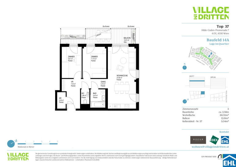 Im dritten Wiener Gemeindebezirk entsteht mit dem VILLAGE IM DRITTEN ein neues Stück Stadt – eines der größten Stadtentwicklungsgebiete Wiens. Auf über elf Hektar entwickelt die ARE Austrian Real Estate gemeinsam mit der Stadt Wien und dem wohnfonds_wien ein lebendiges, nahezu autofreies Quartier mit rund 2.000 Wohnungen, Büro- und Gewerbeflächen, Kinderbetreuung, Bildungseinrichtungen und Nahversorgung. Das grüne Herz bildet der über 2 Hektar große Bert-Brecht-Park –eine Oase für Erholung, Begegnung und Spiel. Alle Dächer, die nicht begehbar sind, werden begrünt. Sharing-Angebote, Einkaufsmöglichkeiten und Gastronomie liegen direkt vor der Haustüre. Nachhaltigkeit, kurze Wege und hohe Lebensqualität sind die Leitlinien dieses neuen Stadtviertels.