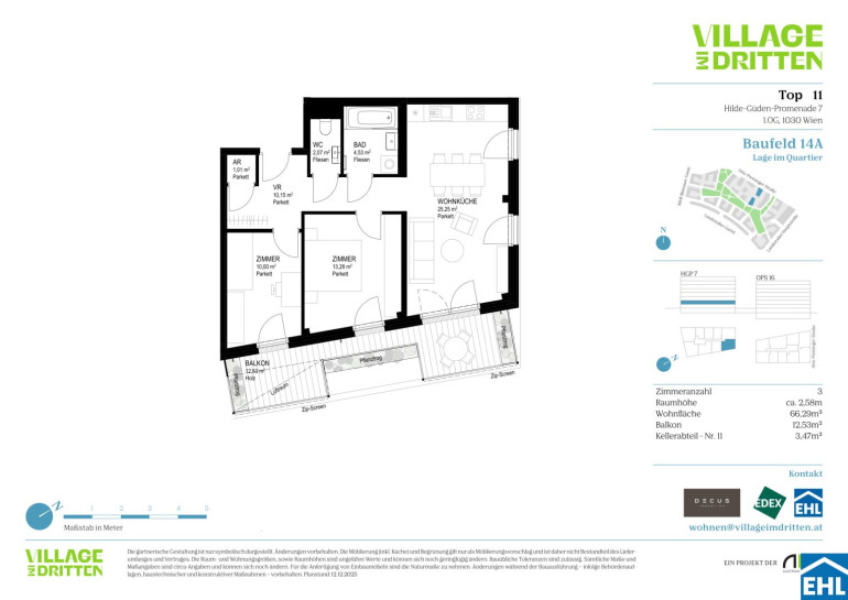 Im dritten Wiener Gemeindebezirk entsteht mit dem VILLAGE IM DRITTEN ein neues Stück Stadt – eines der größten Stadtentwicklungsgebiete Wiens. Auf über elf Hektar entwickelt die ARE Austrian Real Estate gemeinsam mit der Stadt Wien und dem wohnfonds_wien ein lebendiges, nahezu autofreies Quartier mit rund 2.000 Wohnungen, Büro- und Gewerbeflächen, Kinderbetreuung, Bildungseinrichtungen und Nahversorgung. Das grüne Herz bildet der über 2 Hektar große Bert-Brecht-Park –eine Oase für Erholung, Begegnung und Spiel. Alle Dächer, die nicht begehbar sind, werden begrünt. Sharing-Angebote, Einkaufsmöglichkeiten und Gastronomie liegen direkt vor der Haustüre. Nachhaltigkeit, kurze Wege und hohe Lebensqualität sind die Leitlinien dieses neuen Stadtviertels.