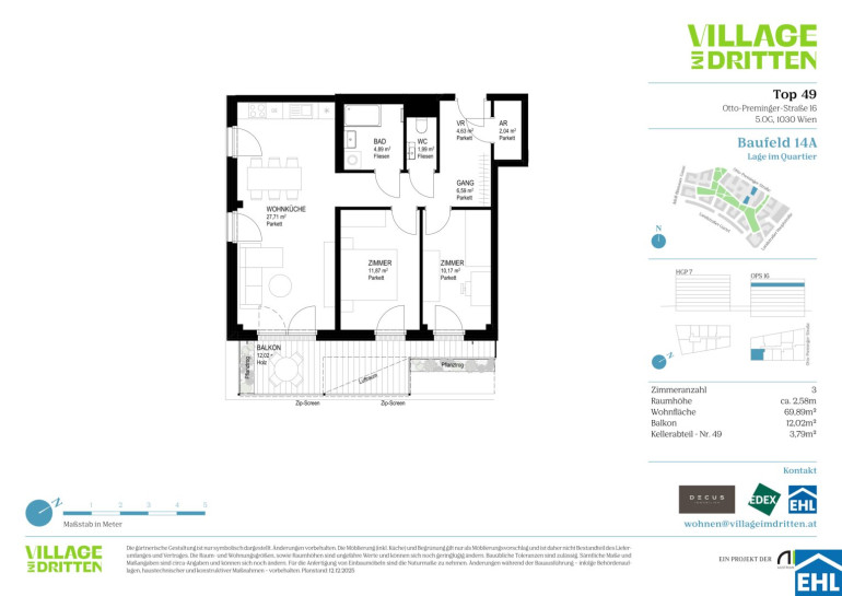 Im dritten Wiener Gemeindebezirk entsteht mit dem VILLAGE IM DRITTEN ein neues Stück Stadt – eines der größten Stadtentwicklungsgebiete Wiens. Auf über elf Hektar entwickelt die ARE Austrian Real Estate gemeinsam mit der Stadt Wien und dem wohnfonds_wien ein lebendiges, nahezu autofreies Quartier mit rund 2.000 Wohnungen, Büro- und Gewerbeflächen, Kinderbetreuung, Bildungseinrichtungen und Nahversorgung. Das grüne Herz bildet der über 2 Hektar große Bert-Brecht-Park –eine Oase für Erholung, Begegnung und Spiel. Alle Dächer, die nicht begehbar sind, werden begrünt. Sharing-Angebote, Einkaufsmöglichkeiten und Gastronomie liegen direkt vor der Haustüre. Nachhaltigkeit, kurze Wege und hohe Lebensqualität sind die Leitlinien dieses neuen Stadtviertels.