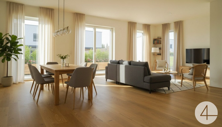 Im Erdgeschoss öffnet sich der helle Wohn - Ess und Kochbereich mit dem direkten Zugang zur sonnigen Terrasse, der perfekte Ort für gesellige Stunden. Die offene Küche mit Kochinsel und der großzügige Wohnraum schaffen eine kommunikative Atmosphäre. Ein Gästezimmer/Büro, ein kleines Gäste Badezimmre mit Dusche sowie ein praktischer Technik bzw. Abstellraum komplettieren das Erdgeschoss.