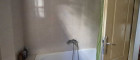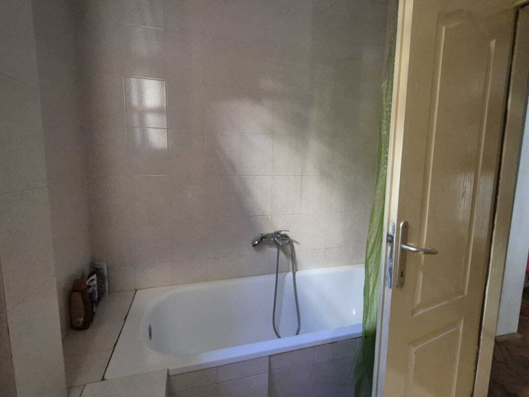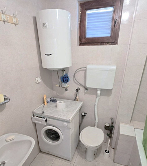 Das Bad ist mit einer Badewanne, WC und Waschmaschine ausgestattet.