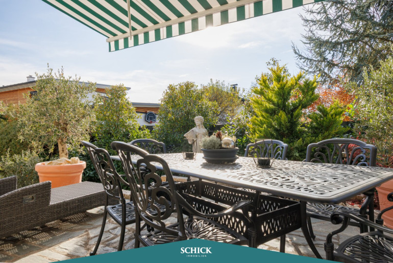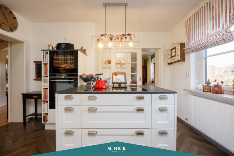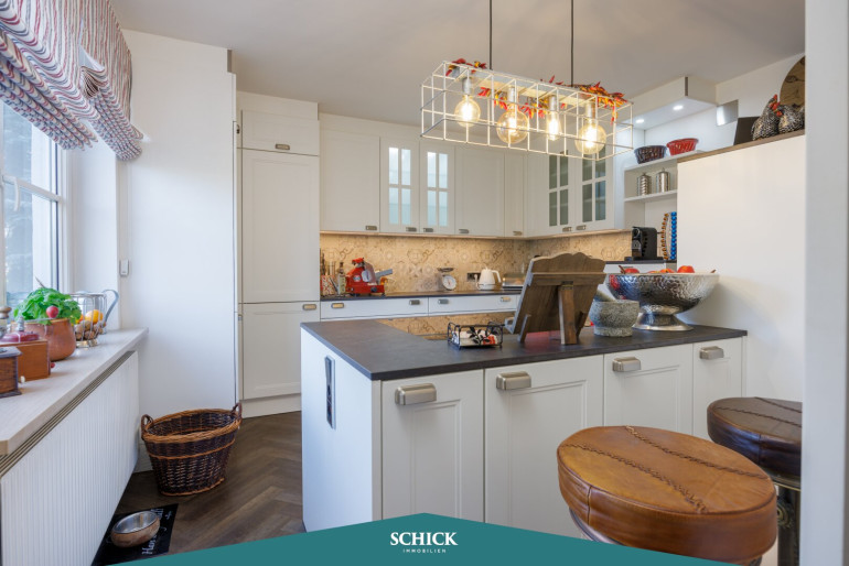 Im Erdgeschoss gibt es eine gut zwei Jahre junge moderne Küche. Ausgestattet mit einer eleganten Kochinsel, Vollflächen-Induktionsherd und Backofen in ergonomischer Höhe. Die Schiebetür öffnet sich und führt Sie in den großzügigen Wohn-Essbereich, der mit einem gemütlichen Kamin ausgestattet ist samt Zugang zur XL-Sonnen-Terrasse.