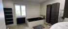 Badezimmer mit Fenster, Badewanne und vorbereiteter Dusche
