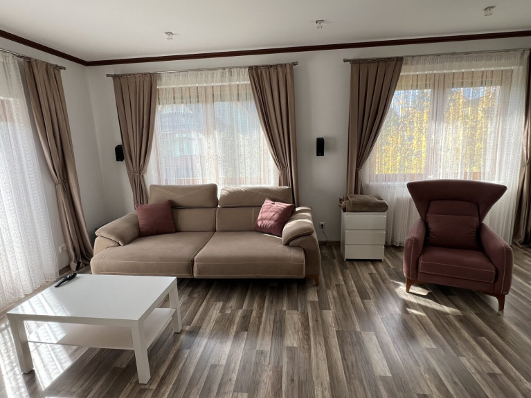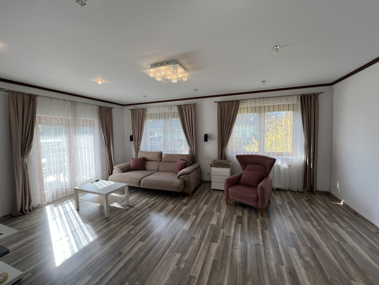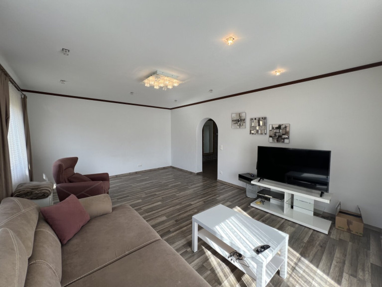 Wohnzimmer mit Ausgang auf die ca. 30 m² große Terrasse mit Markise (unterhalb der Terrasse zusätzlicher Stauraum)