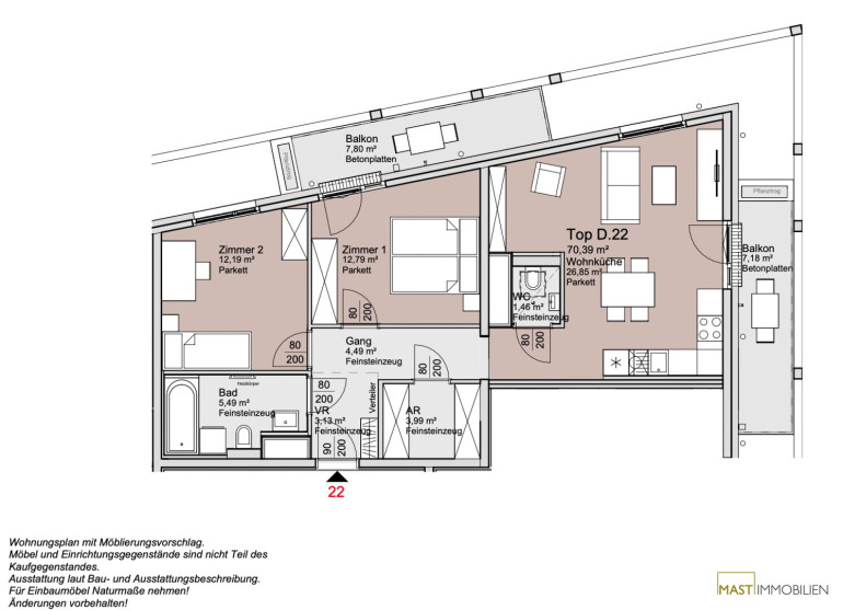 Die Wohnung befindet sich im 3. Liftstock und verfügt über 70,39 m² Wohnfläche + zwei insgesamt 14,98 m² große Balkone.