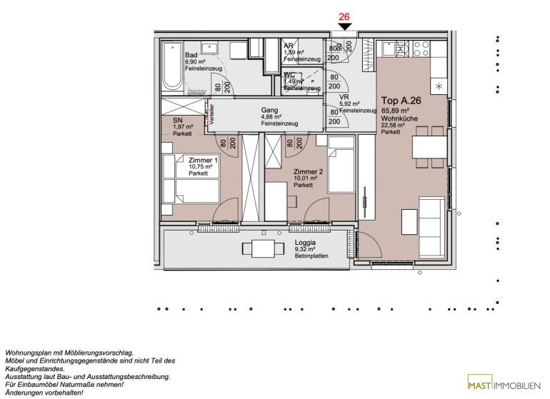 Die Wohnung befindet sich im 4. Liftstock und verfügt über 65,89 m² Wohnfläche + einen 9,32 m² große Loggia.