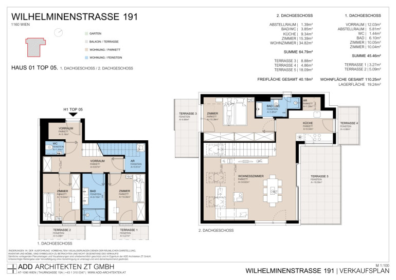 Die sich über das 1. Und 2. Dachgeschoss erstreckende Maisonettwohnung beeindruckt mit insgesamt 5 Terrassen. Jedes Zimmer ist mit einer eigenen kleinen Terrasse ausgestattet. Von der Hauptterrasse aus liegt einem Wien zu Füßen. Außerdem verfügt die Wohnung über: