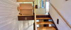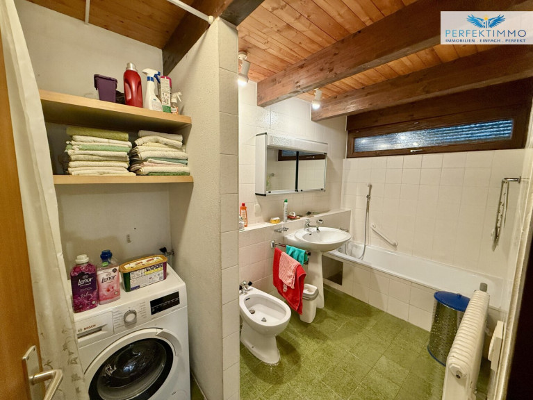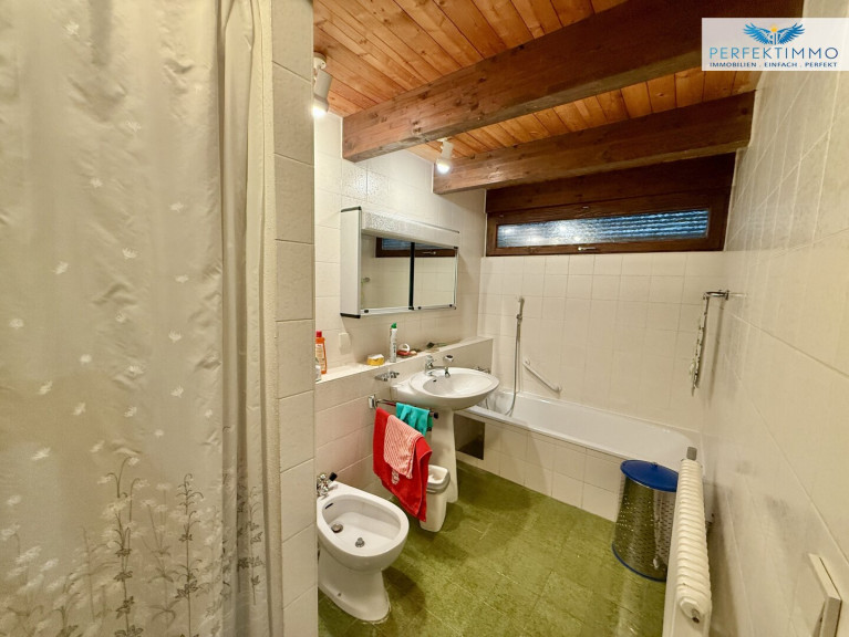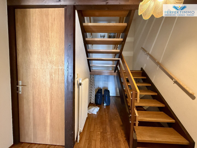 Eine Treppe führt in die mittlere Etage, die das Schlafzimmer, ein weiteres kleineres Zimmer, das Badezimmer mit Badewanne und ein separates WC beinhaltet
