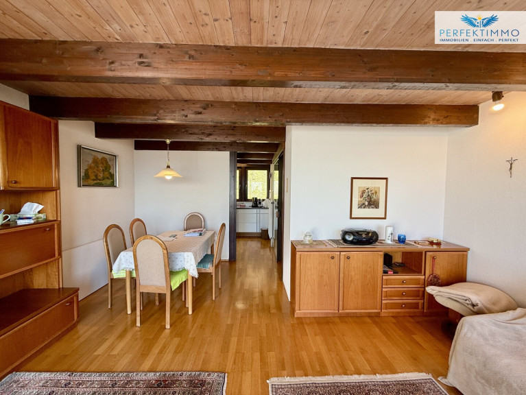 Das Obergeschoss besteht aus dem Wohn und Essbereich mit Zugang zum oberen Balkon. Auch hier kann durch Entfernen der Wände ein offener heller Bereich geschaffen werden. Die Aussicht ist spektakulär!