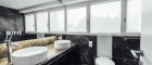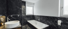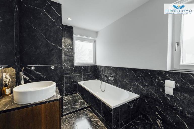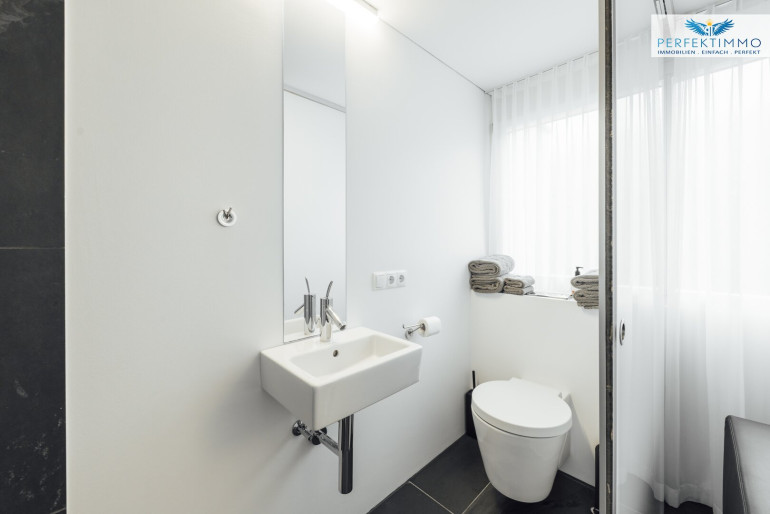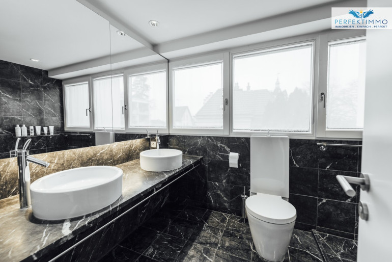 Die Bäder sind mit edlem Marmor und hochwertiger Sanitärkeramik von Duravit (Design: Philippe Starck) ausgestattet. In der Designer-Küche von Poggenpohl mit Gaggenau-Geräten wird Kochen zum Erlebnis. Ein ausgefeiltes Beleuchtungskonzept von Zumtobel sorgt für stimmungsvolle Lichtakzente, ergänzt durch eine stilvolle Außenbeleuchtung.