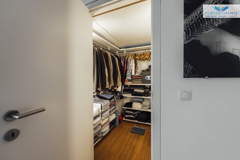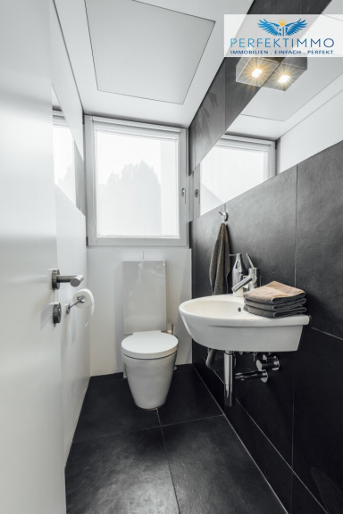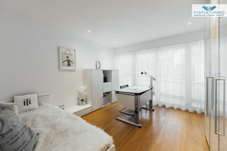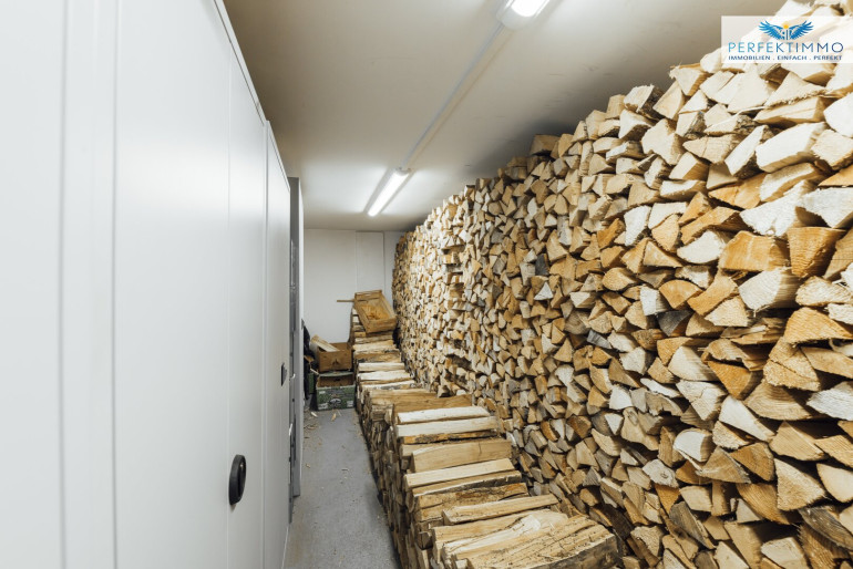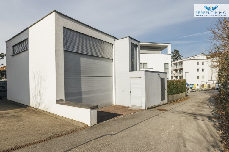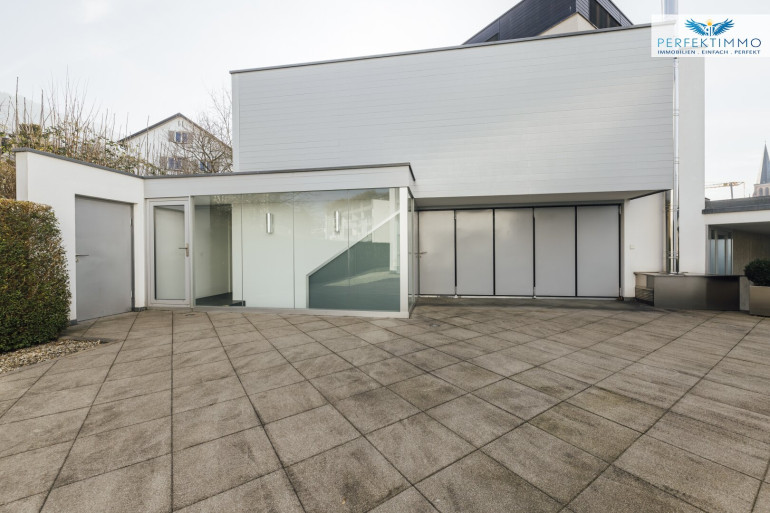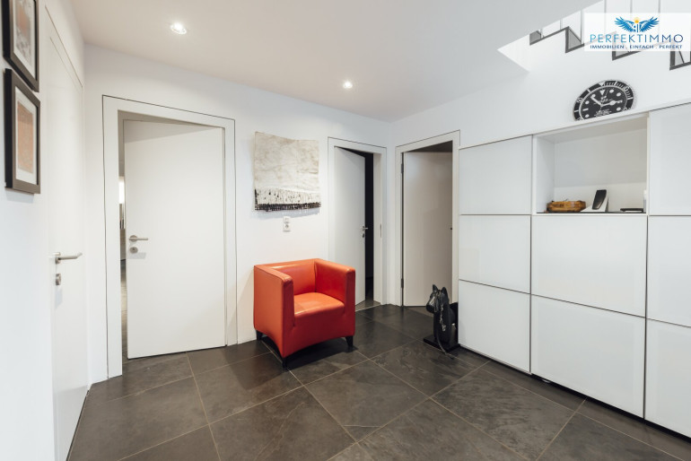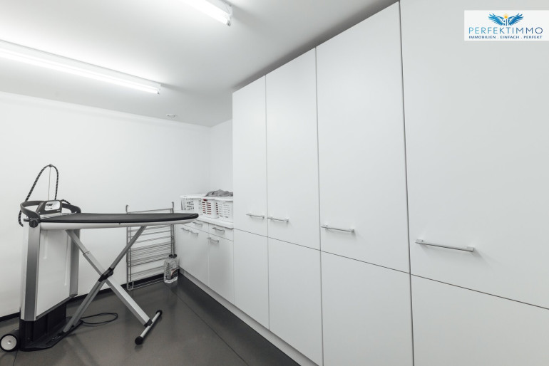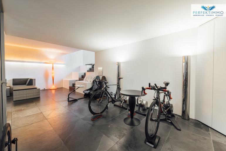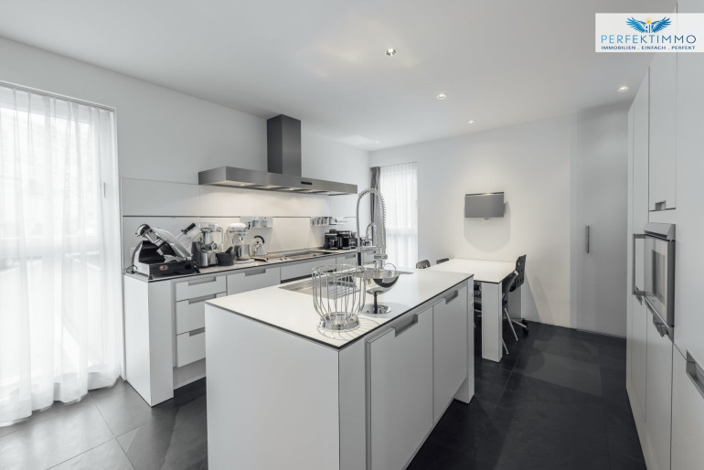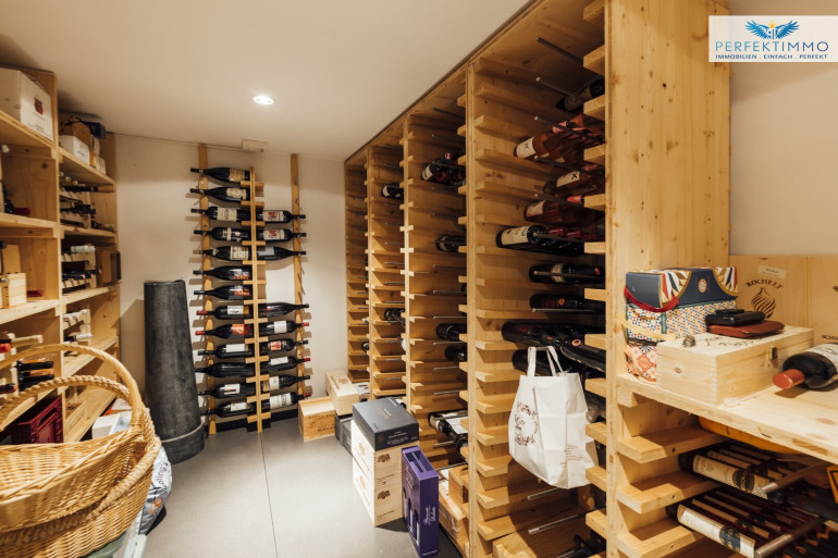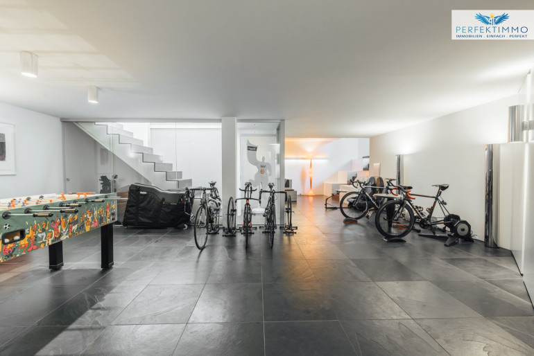 Weitere Highlights sind ein Weinkeller mit Weinregalen, eine hochwertige Lista-Werkbank mit Werkzeugschrank sowie maßgefertigte Tischler-Einbaumöbel. Die großzügige Dachterrasse mit Markise und eine Pergola mit Abstellraum für Gartenmöbel runden das exklusive Gesamtpaket ab.
