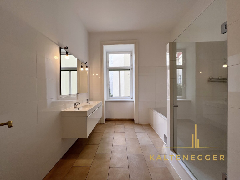 - Tageslichtbad mit Badewanne, Dusche, Doppelwaschbecken und Waschmaschinenanschluss