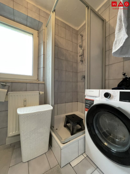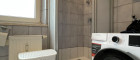 - modernes Badezimmer mit Eckdusche, Waschmaschinenanschluss und Fenster
