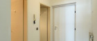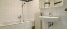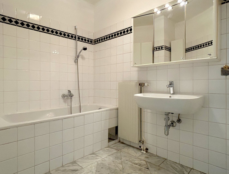 Mit dem Lift geht’s in den 2. Stock, schräg vis-a-vis der Eingang. Eingetreten der Vorraum mit Garderobe, rechts gleich das Badezimmer. Sehr hell, mit marmorierten Bodenfließen und einem klassischen Selbstbildnis. Wie erwartet mit Badewanne, Waschmaschinenanschluss und WC. Gegenüber ein praktischer Abstellraum.