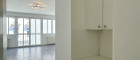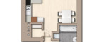 Und der Rest eröffnet sich als hübsches One-Room-Apartment in dezentem weiß mit grau. Ziemlich quadratisch, dadurch perfekt nutzbar. Die Küchenzeile gut einsetzbar, ein Esstisch per Due gleich an die Arbeitsfläche angeschlossen.