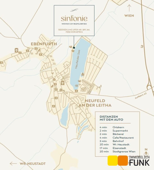Die Lage besticht durch ihre Nähe zu Wien, zu Eisenstadt und der guten Erreichbarkeit des Flughafens. Die Fahrzeit in das Stadtzentrum Wiens und zum Flughafen Schwechat beträgt jeweils etwa 45 Minuten, in nur ca. 15 Minuten erreichen Sie Eisenstadt. Die Anbindung an das öffentliche Verkehrsnetz erfolgt über regionale Buslinien bzw. den Bahnhof Neufeld a.d. Leitha.