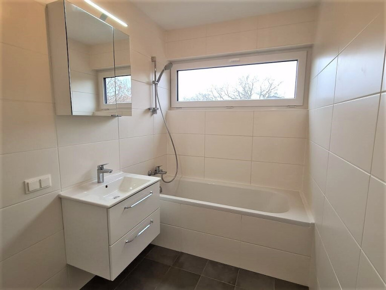 + Badezimmer mit Badewanne, Waschtisch und Waschmaschinenanschluss