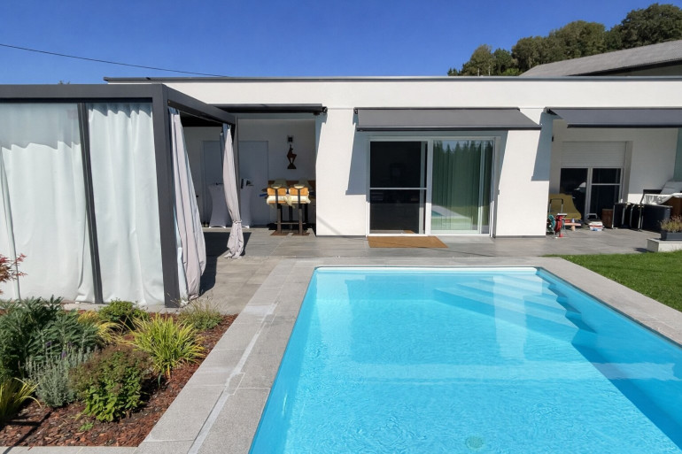 Leistbarer Luxusbungalow Tiroler Style mit Pool, Gartenhaus, Pavillon, Doppelcarport und PV-Anlage
