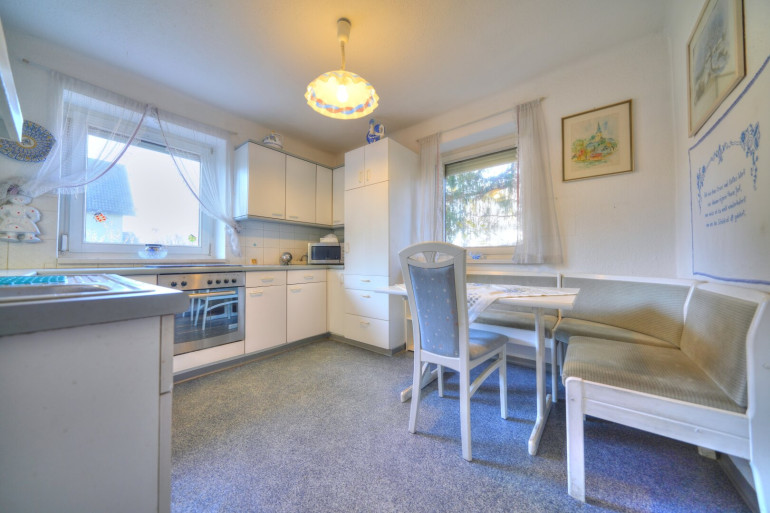 Fliesen, Laminatboden, Öl, Zentralheizung, Einbauküche, Südbalkon, Bad mit Fenster, Badewanne, Garage, Parkplatz