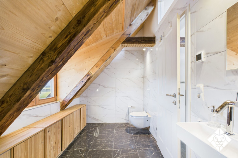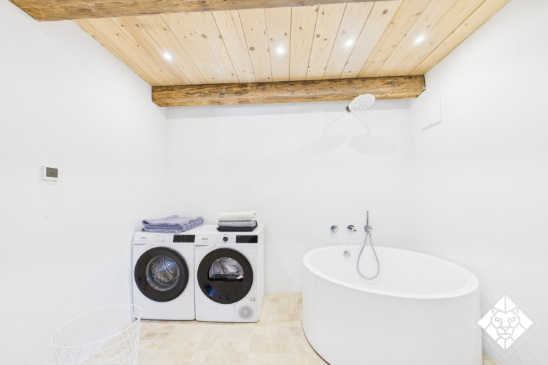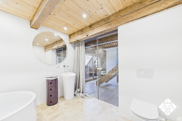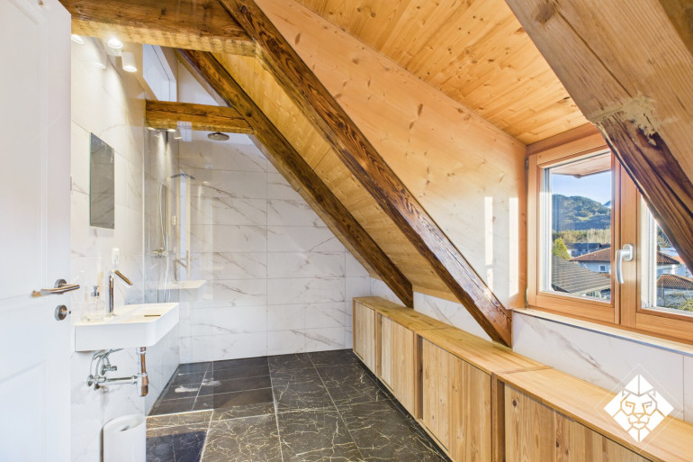 Über eine stilvolle Holztreppe gelangt man in den ersten Stock zum Master-Schlafzimmer mit eigenem Badezimmer en suite, ausgestattet mit edlen Armaturen, einer Walk-in-Dusche und hochwertigen Oberflächen – ein exklusiver Rückzugsort zum Wohlfühlen.