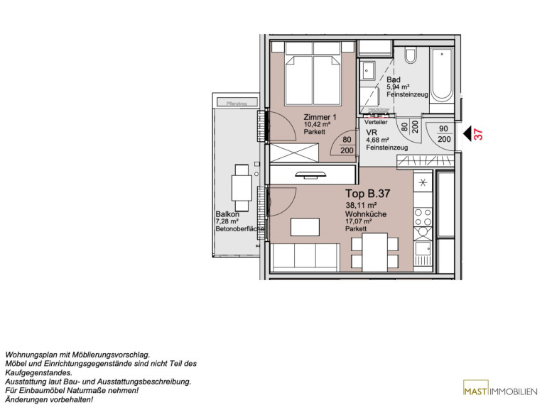 Die Wohnung befindet sich im 5. Liftstock und verfügt über 38,11 m² Wohnfläche + ein 7,28 m² großer Balkon.