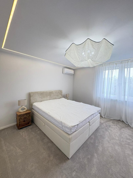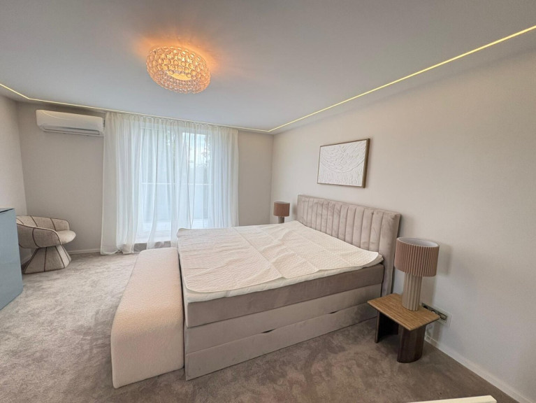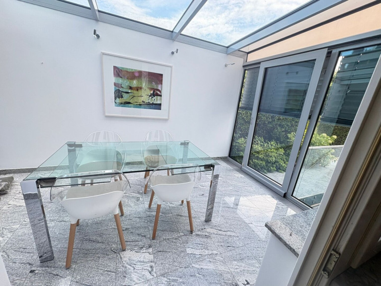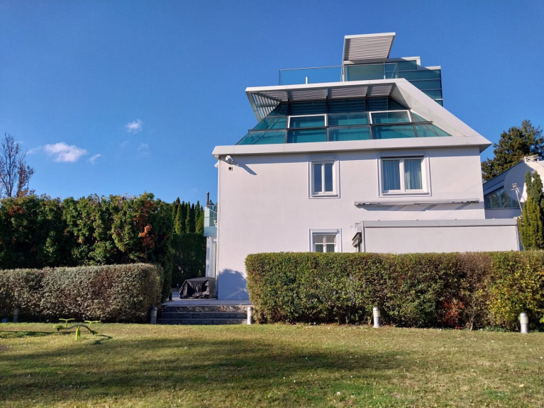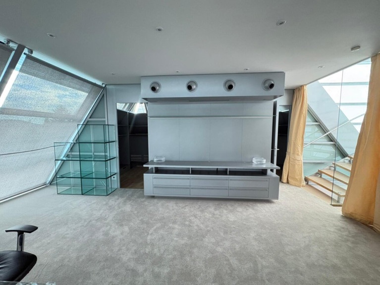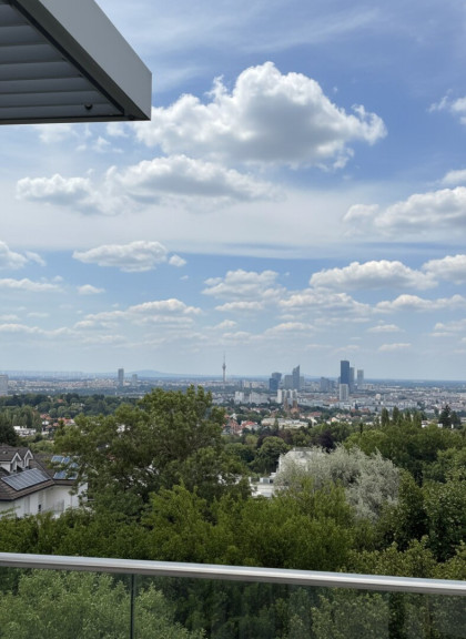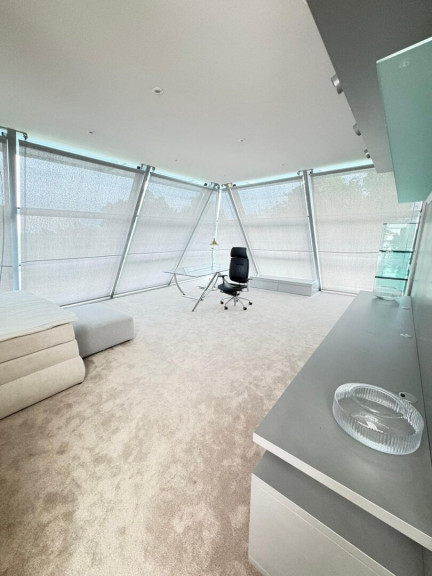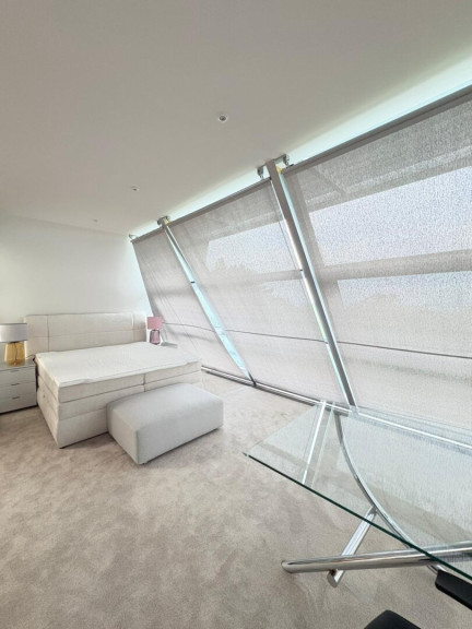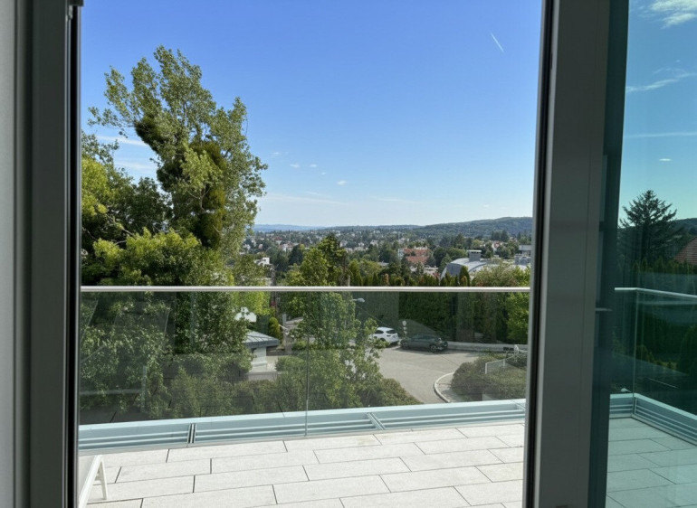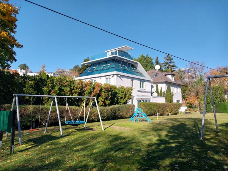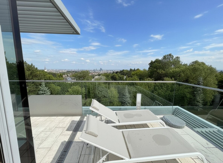 - 3 Schlafzimmer, darunter ein beeindruckender Master Bedroom im 2. Obergeschoss mit 180°-Panoramablick auf Wien – dank der gläsernen Kuppelkonstruktion ein echtes Highlight. Elektronische Innenrollos sorgen für Privatsphäre und Sonnenschutz.
