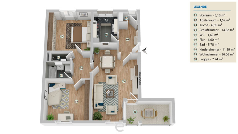 Optimale Raumaufteilung: Einladender Vorraum/Garderobe, 2 geräumige Schlafzimmer, helles Wohnzimmer mit Kamin und Direktzugang zur Loggia (auch als Wohnraum nutzbar), Einbauküche und ein modernes Badezimmer. Ein separates WC und ein praktischer Abstellraum ergänzen den hohen Wohnkomfort.