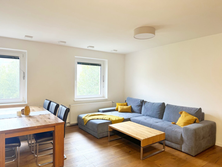 Vom Eingangsbereich aus gelangt man in den Wohn-, Koch- und Essbereich mit Einbauküche. Weiteres stehen ein Badezimmer mit Badewanne und Duschvorrichtung, ein Schlafzimmer und ein separates WC zur Verfügung. Durch die großzügigen Fenster ist die Wohnung sehr hell und freundlich.