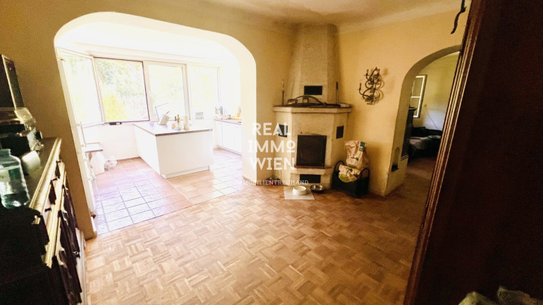 Absolute Grünruhelage am Wienerwald! Wunderschöner Kachelofen und offener Kamin. GRUENRUHELAGE Offene Küche mit großer Fensterfront und Blick in Gärten und Wald