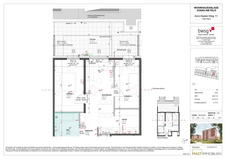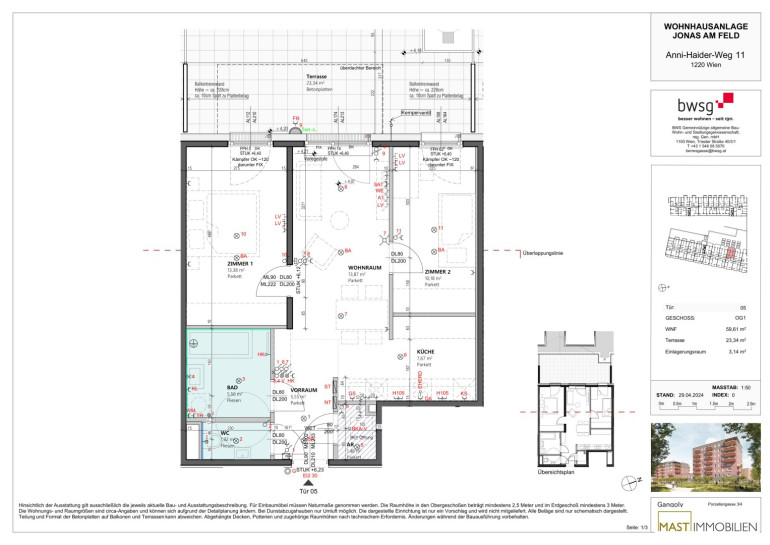 Die Wohnung befindet sich im 1. OG und verfügt über 59,61 m² Wohnfläche + eine 23,34 m² große Terrasse.