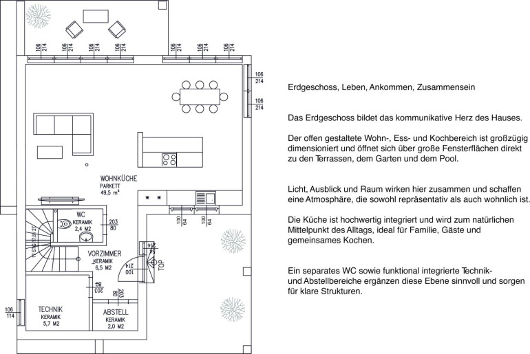 Der Grundriss überzeugt durch eine offene, großzügige Raumaufteilung und eine klare Trennung von Wohn- und Rückzugsbereichen. Die Kombination aus 154 m² Wohnfläche und außergewöhnlich großen Außenflächen schafft ein Wohngefühl von Weite, Licht und Privatsphäre. Der offen gestaltete Wohn-, Ess- und Kochbereich bildet das Herzstück des Hauses. Große Fensterflächen sorgen für viel Tageslicht und eröffnen den Blick in den Garten, zum Pool und über Graz. Der direkte Zugang zu den Terrassen schafft eine fließende Verbindung zwischen Innen- und Außenraum.