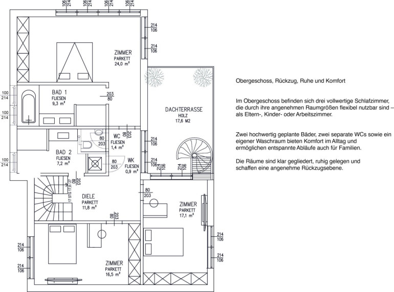 Im Obergeschoss befinden sich drei großzügig geplante Schlafzimmer, flexibel nutzbar als Eltern-, Kinder- oder Arbeitszimmer. Zwei elegant gestaltete Bäder, zwei WCs sowie ein separater Waschraum sorgen für Komfort und entspannte Abläufe im Alltag.