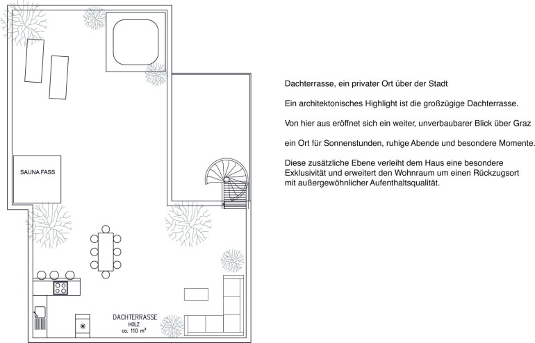 Ein herausragendes Merkmal dieses Hauses ist der freie, unverbaubare Stadtblick über Graz. Durch die erhöhte Lage und die sorgfältige Planung bleibt dieser Ausblick dauerhaft erhalten. Ob vom Wohnbereich, von den großzügigen Terrassen oder von der Dachterrasse dieser Ausblick vermittelt Weite, Ruhe und Exklusivität. In Zeiten zunehmender Nachverdichtung ist eine unverbaubare Aussicht ein echter Mehrwert: nicht reproduzierbar, wertstabil und nachhaltig. Das Haus ist großzügig, modern und hochwertig. Die Architektur ist klar, zeitlos und auf langfristige Wohnqualität ausgelegt.