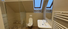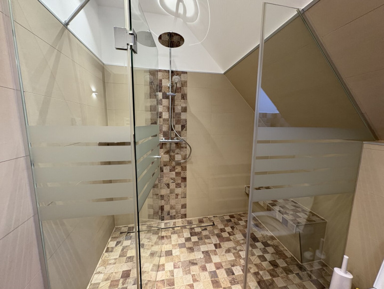 Im oberen Stock befindet sich ein Schlafzimmer und ein Badezimmer welches keine Wünsche offen lässt. Genießen Sie entspannende Momente in einem modernen Bad.