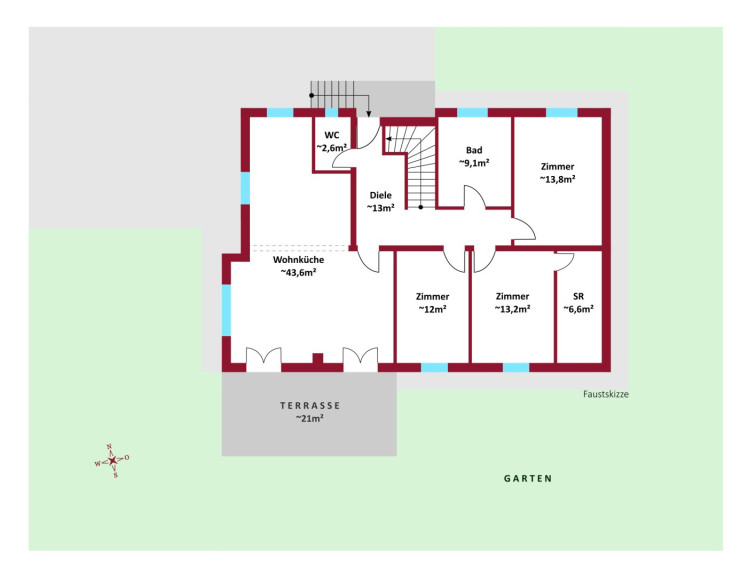 - ca. 43,6m² große Wohnküche mit Ausgang auf die ca. 21m² große Terrasse