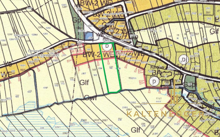 - BW-2WE (Bauland: Wohngebiete) ca. 850 m²; der Rest der Grundstücksfläche ist als "Glf" (Grünland: Land- und Forstwirtschaft) gewidmet