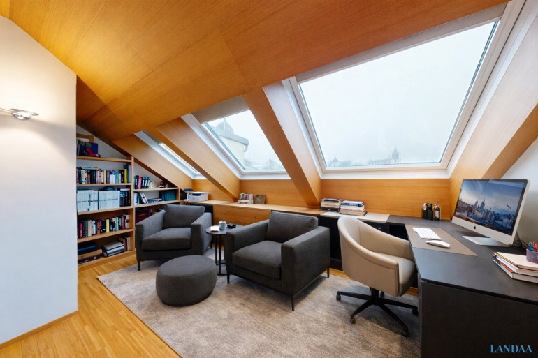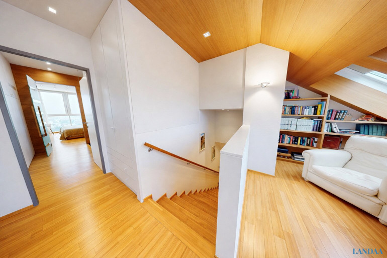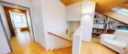 Über eine innenliegende Treppe gelangt man auf die zweite Ebene, die als privater Rückzugsbereich konzipiert ist. Hier eröffnet sich zunächst ein offener Arbeits- oder Galeriebereich, der sich ideal als Homeoffice, Lesezone oder zusätzlicher Aufenthaltsraum eignet und dem Objekt eine besondere architektonische Note verleiht.