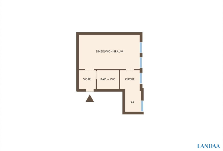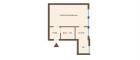 Der einladende Vorraum öffnet den Zugang zu allen Räumen. Das großzügige Wohn- und Schlafzimmer bietet ausreichend Platz für eine flexible Gestaltung und schafft eine angenehme Wohnatmosphäre. Die Küche ist durch eine Wand vom Wohnbereich getrennt und somit praktisch in den Grundriss integriert.