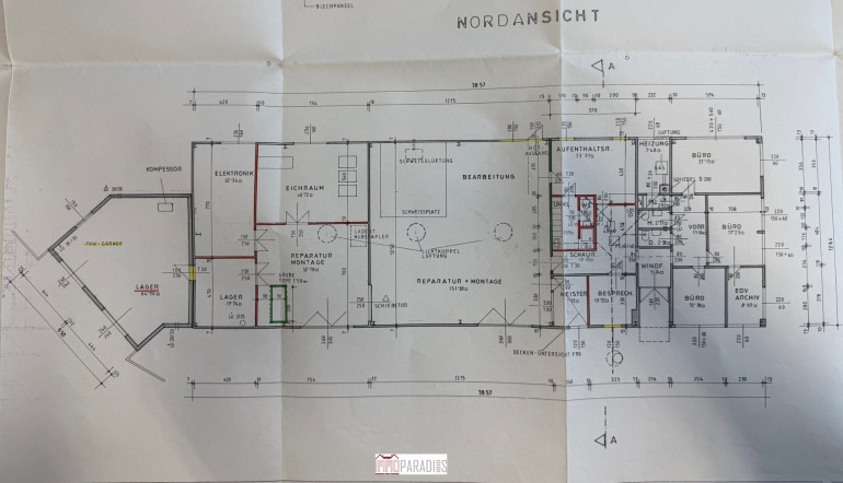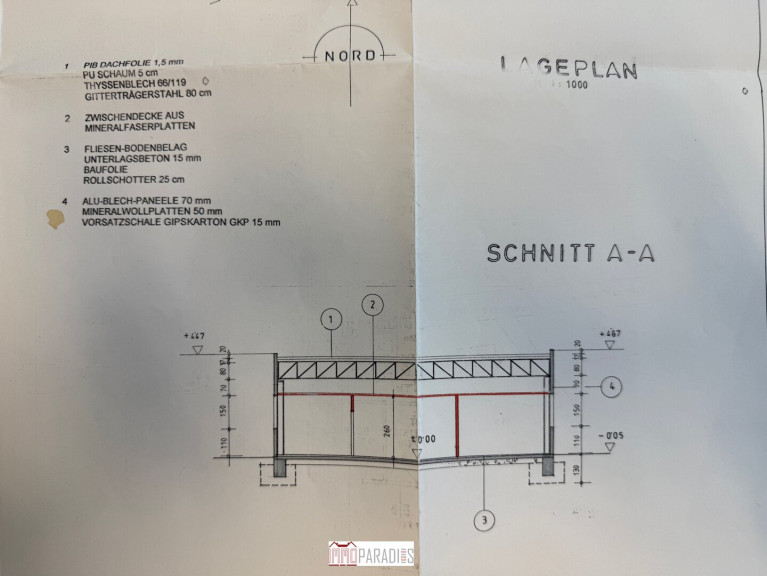 Auf dem Grundstück befindet sich derzeit eine ca. 510 m² große, beheizte Bestandshalle, die sich in teilweise sanierungsbedürftigem Zustand (an mehreren Stellen Wassereintritte durch undichtes Dach) befindet. Das Objekt eignet sich ideal für Neuentwicklung, Revitalisierung oder Ersatzneubau im betrieblichen / gewerblichen Kontext.