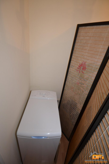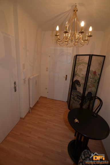 Vorzimmer: Die Wohnung wird durch eine einflügelige Eingangstür betreten und ist ausreichend groß für Garderobe und andere Möbelstücke. Hinter einem Raumteiler befindet sich eine Waschmaschine, die in der Wohnung verbleibt. Dieser Bereich ist, wie auch die Wohnräume mit Laminatboden ausgestattet.