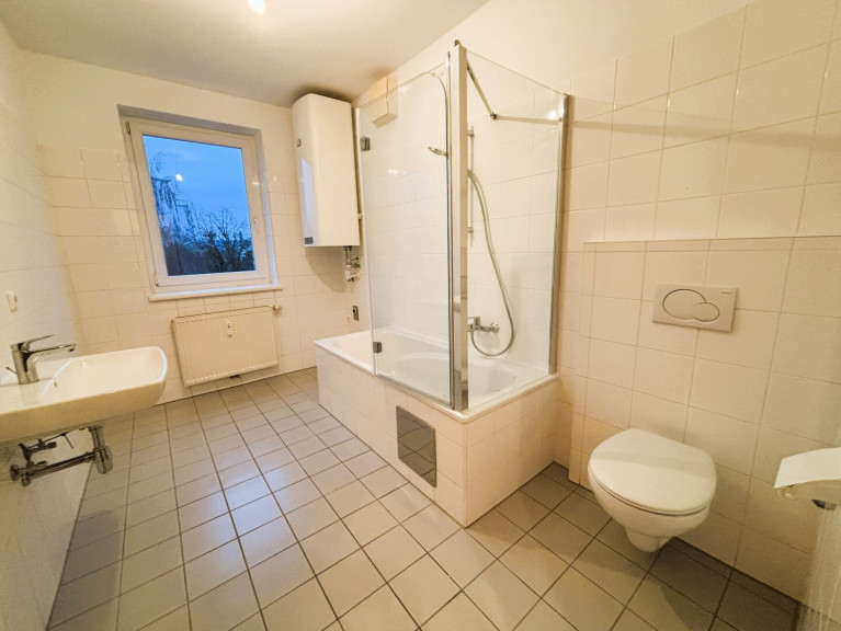 2-Zimmer-Wohnung mit großem Wohnbereich und neuer Einbauküche, Schlafzimmer mit eigenem Schrankraum, Badezimmer mit Badewanne, WC und Fenster.