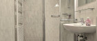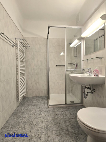 - Badezimmer mit Dusche, Waschbecken, Handtuchwärmer, WC