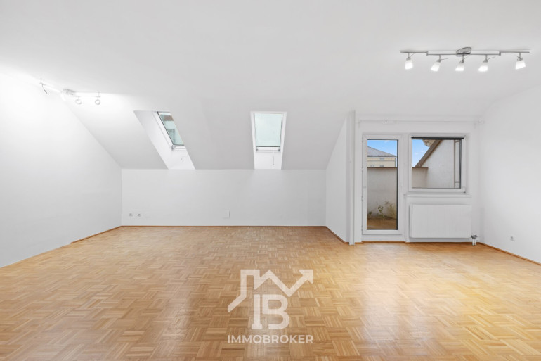 Das absolute Highlight der Wohnung ist das außergewöhnlich großzügige Wohnzimmer – ein Raum, der Wohnen neu definiert. Durch die großen Dachflächenfenster präsentiert sich der Bereich hell und offen, während die direkte Anbindung an einen Balkon ein unvergleichliches Wohngefühl schafft. Ob stilvolle Lounge-Ecke, gemütlicher Essbereich oder eine zusätzliche Leseecke – hier entsteht ein Lebensraum mit besonderer Wirkung und maximaler Gestaltungsmöglichkeit.
