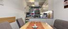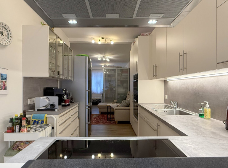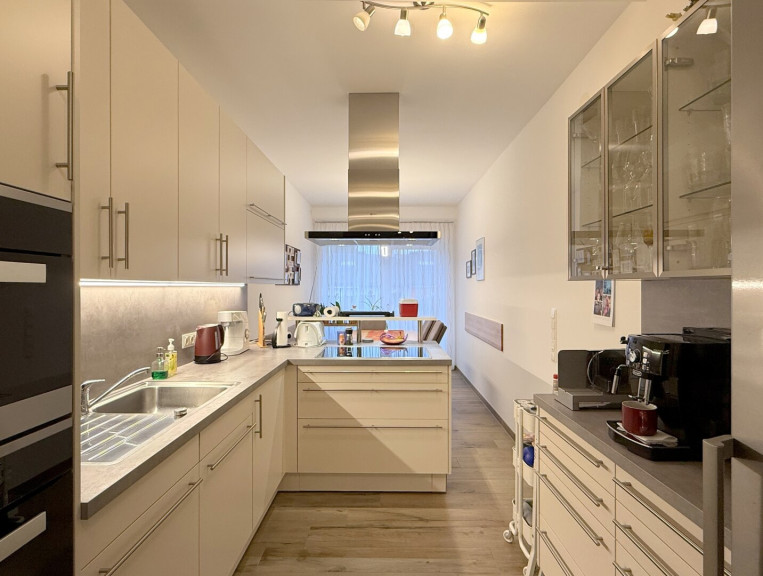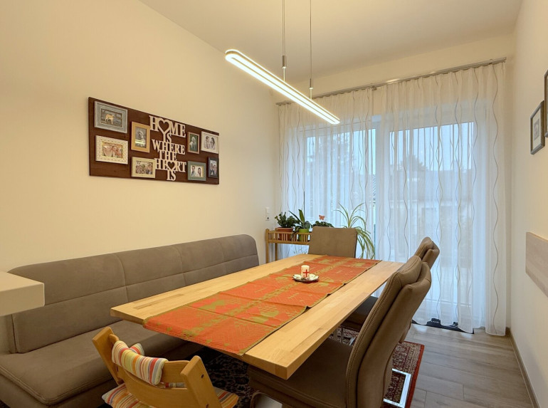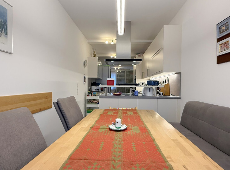 Der Wohnbereich geht fließend in die neue Küche über. Hübsch gestaltet, angenehm zurückhaltend und genau richtig dimensioniert. Am Ende wartet der Essplatz, groß genug für Gäste, klein genug, um sich sofort wohlzufühlen. Von hier führt eine Tür nach draußen – auf die andere Seite des Hauses, ostseitig. Ein zweiter Ausgang, der mehr kann, als man zunächst vermutet.