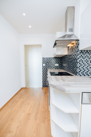 Die moderne Designer-Küche ist ein echtes Highlight: hochwertig ausgestattet, funktional durchdacht und mit Platz für einen Esstisch, der durch Deckenspots angenehm beleuchtet wird. Ob schnelles Frühstück oder gemütliches Dinner – hier kochen und genießen Sie mit Stil.