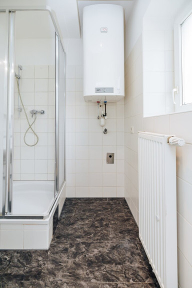 Das Badezimmer ist modern gestaltet, mit Dusche und Fenster, das für Tageslicht und frische Luft sorgt. Die separate Toilette bietet zusätzlichen Komfort.