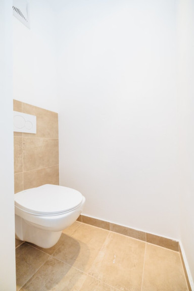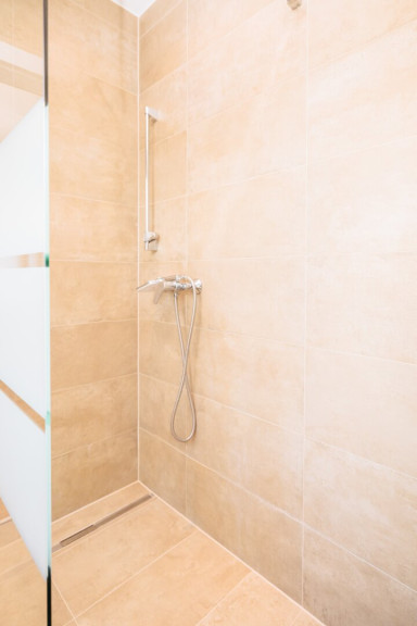 Das Badezimmer überzeugt mit stilvollem Design, ebenerdiger Dusche, großem Spiegel und viel Tageslicht durch das Fenster. Praktisch integriert ist hier auch der Anschluss für Ihre Waschmaschine. Ein separates WC sorgt zusätzlich für Komfort.