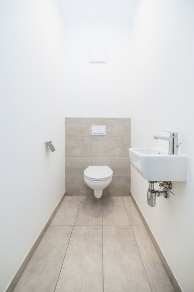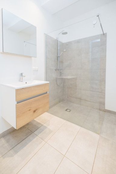 Das Schlafzimmer strahlt Ruhe aus und bietet dank Smart Home-Anbindung höchste Flexibilität in Licht- und Temperatursteuerung. Das Badezimmer ist modern ausgestattet mit einer ebenerdigen Walk-In-Dusche, ergänzt durch ein separates WC. Ein Abstellraum mit Waschmaschinenanschluss sorgt für praktische Ordnung im Alltag.